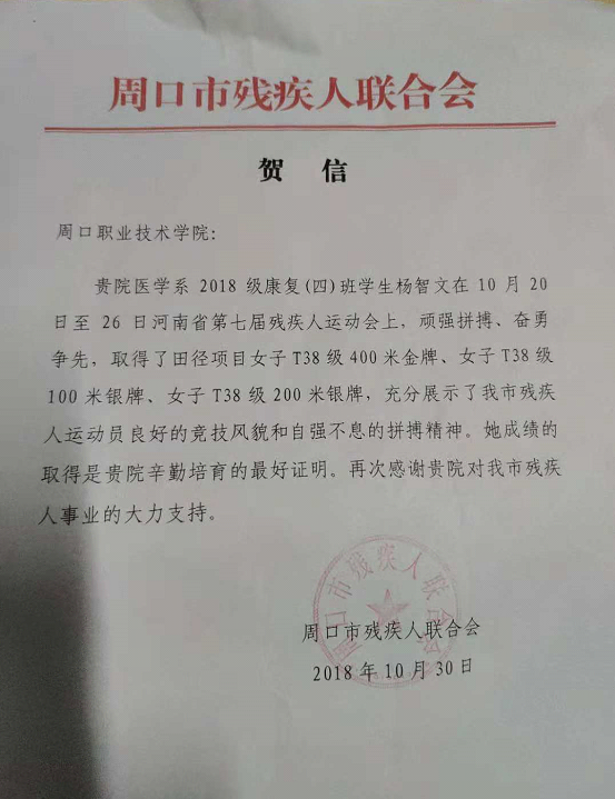 在刚刚结束的河南省第七届残疾人运动会上,beat365中文官方网站2018级大专康复4班学生杨智文代表周口市及我校参赛,取得了女子组T38级100米银牌,200米银牌,400米金牌的佳绩,为我市及我校争得了荣誉。受到市残联的通报佳奖。