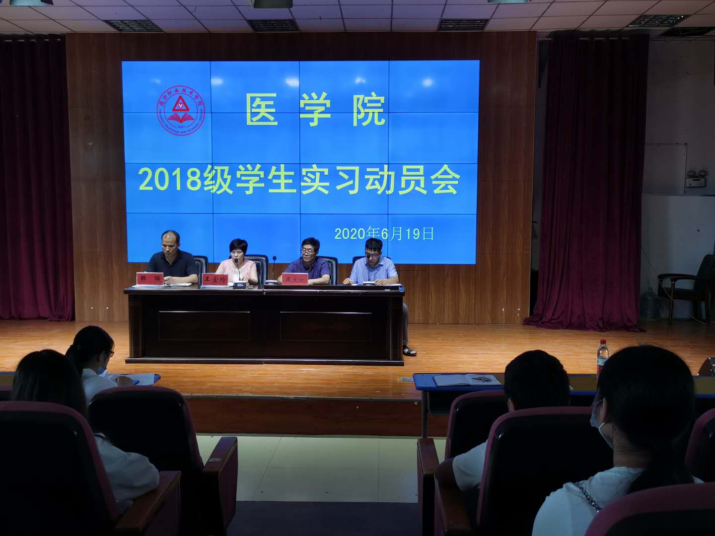 为了让学生明确实习的目的和意义,强调实习纪律和实习安全,让同学们对实习有个正确的认识,能够用正确的态度与行为完成为期一年的医学生实习生涯,6月19日上午,beat365中文官方网站在文昌校区多功能报告厅召开了2018级学生实习动员会,beat365中文官方网站党总支书记周文一、院长王金玲、副院长郭瑞、教务办主任于鑫光及实习带队老师和2018级学生代表参加会议。